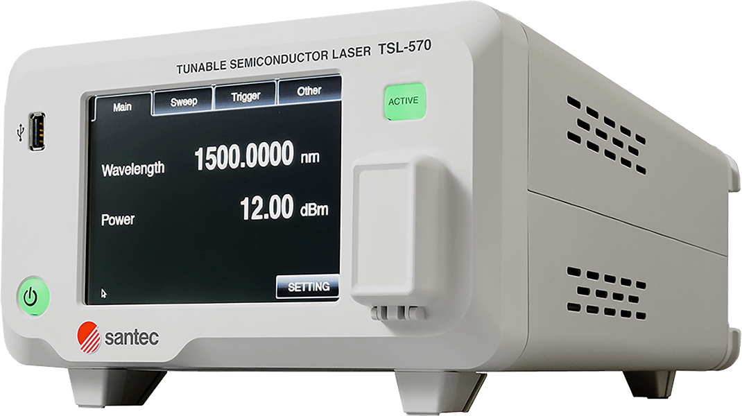 Santec's TSL-570 is a high-specification, full-featured laser for all applications. It has an easy-to-use touch screen and Ethernet, GPIB and USB interfaces for remote control. The Wake on LAN (WoL) feature makes remote installation easy. Available in wavelengths from 1240 to 1680 nm and with output power up to 20 mW, the TSL-570 features a new sealed laser cavity that ensures no mode hopping across the full wavelength range and provides stable output at every wavelength. It has 0.1pm resolution, sub-pico-meter accuracy and a market-leading 90dB/0.1nm ultra-low level signal-to-noise ratio.