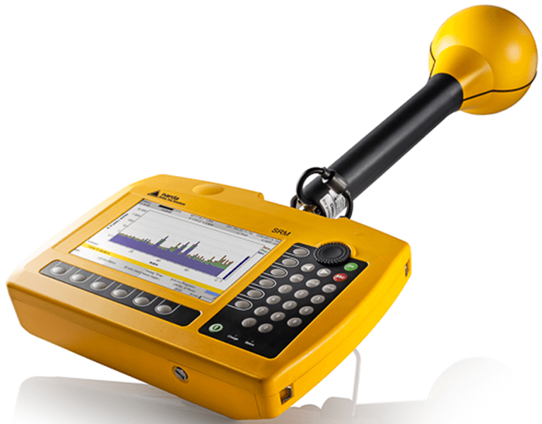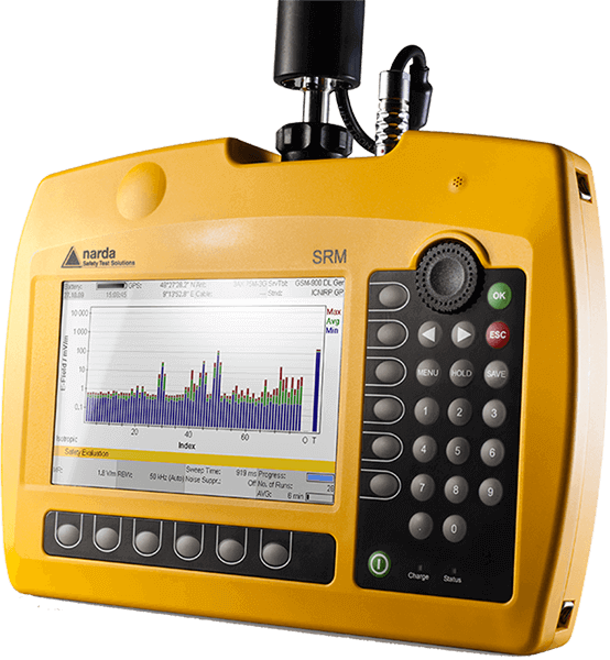The SRM-3006 electromagnetic radiation selective frequency analyzer includes a mainframe and several different types of measurement antennas to perform isotropic measurements and obtain field source information for all signal field strengths in the 9 kHz- 6 GHz range, including 5G NR. The SRM-3006 selective radiation analyzer is a compactly designed selective measurement system for safety analysis and environmental measurements of high-frequency electromagnetic fields, ranging from low-frequency longwave to the latest wireless applications in broadcasting, mobiles telephony and industry.