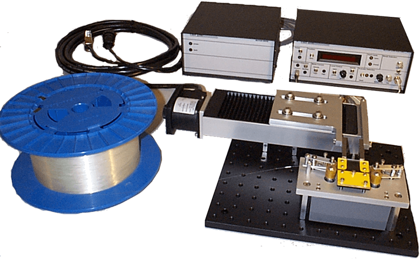 兩點彎曲測試法是在兩個平行的壓板中(zhōng)間放置一個彎曲超過180度的環狀光纖,壓板上開了溝(gōu)槽(cáo)可以固定光纖。通過計算機控製(zhì)的步進電機平移台(以設定恒速(sù)率)移動壓板。當光纖斷裂的時候,通(tōng)過聲波探測回路器使步進馬達停止,然後計算機軟件通過壓板間距來計算光纖疲勞(láo)度及(jí)相關數據。