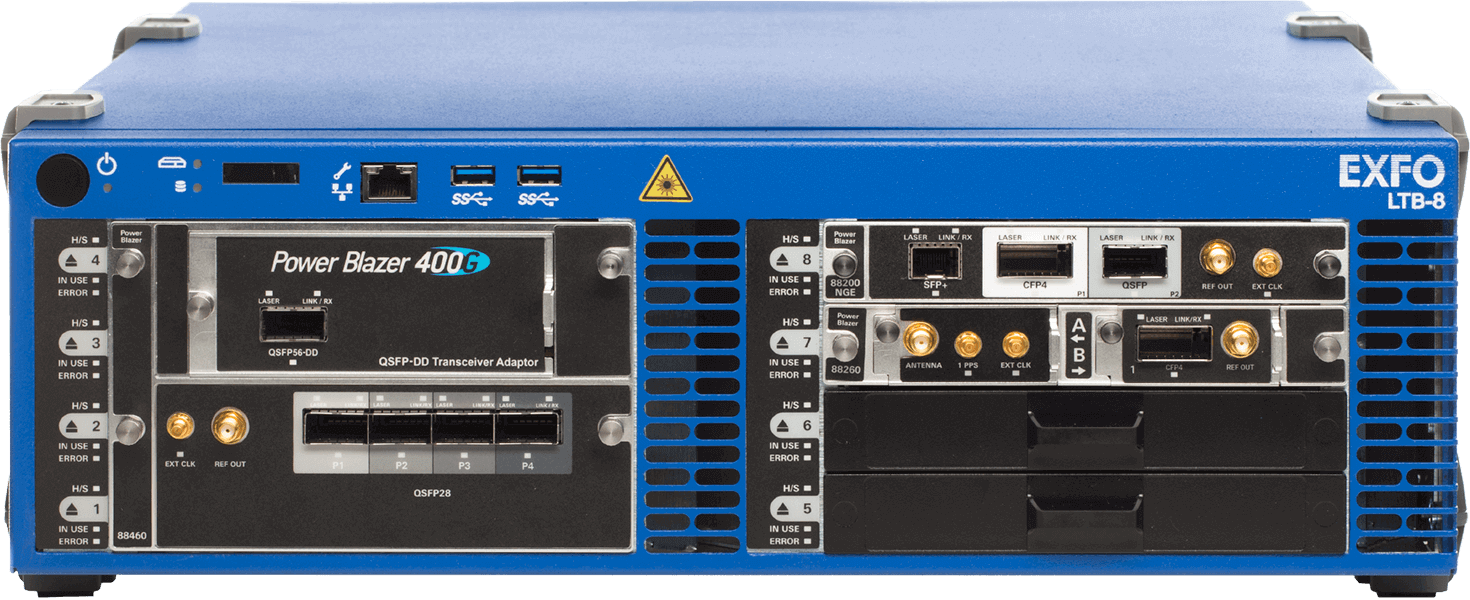 安裝在EXFO的LTB-8機(jī)架(jià)式平台,最多可同時支(zhī)持兩個模塊的運行,成為業內唯一可(kě)進行800G測(cè)試的(de)解(jiě)決方案;在需要(yào)便攜性時,可將FTBx-88460 400G模塊插入到FTB-4 Pro平台內,構成非常緊湊的400G解決方案——便(biàn)於(yú)現場的測試應用(yòng)。